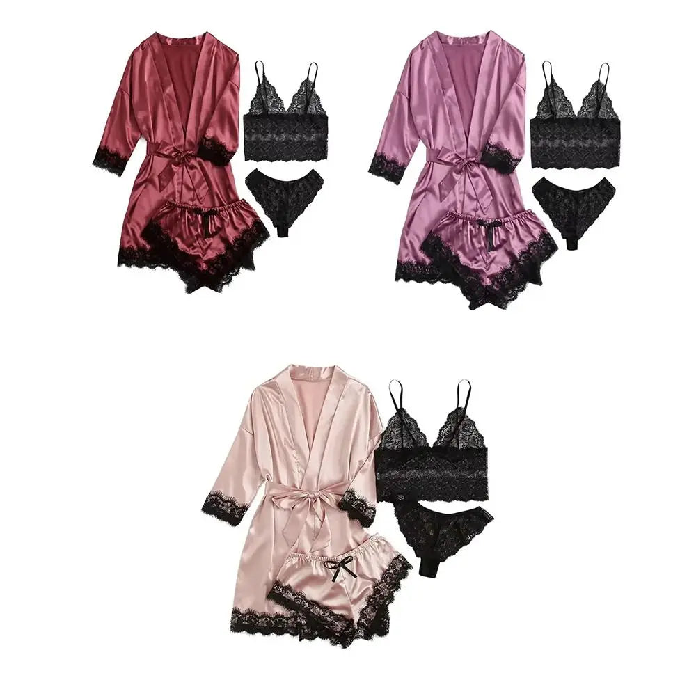 Women Homewear Elegant Satin Pajamas Outfit Bowknot V-Neck Shorts Camisole Nightdress Loose Panties Lace Sleepwear Sets Summer